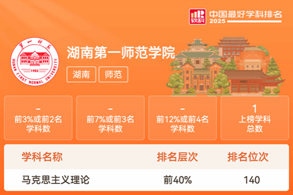 马克思主义理论学科作为我校首批省级应用特色学科,在2022年首轮湖南省“双一流”建设成效评价中,目标达成度、成长提升度、可持续发展度三大类别评价均获“第一档”,总体成效评价结果更为“显著”,并于2024年成功获批为一级学科硕士学位授权点,为学科可持续发展奠定了坚实基础。此次登榜“2025软科中国最好学科排名”标志着我校马克思主义理论学科的全新起点,彰显了其在人才培养、科学研究、社会服务等方面的综合实力。未来马克思主义理论学科将继续深化内涵建设,强化学科特色,提升人才培养质量,为推动学校高质量发展提供坚实支撑。